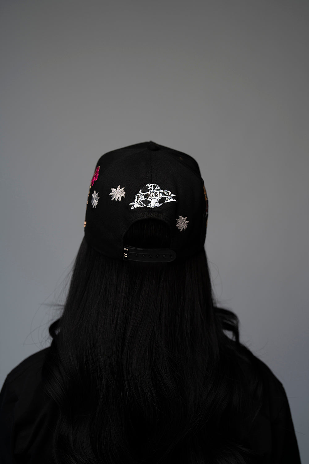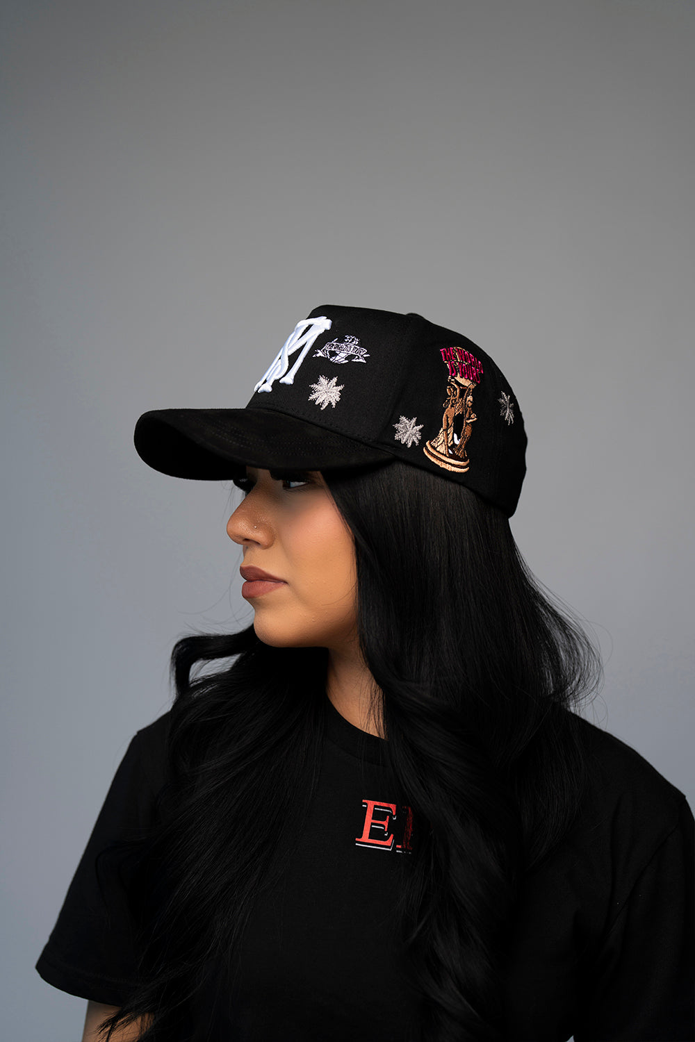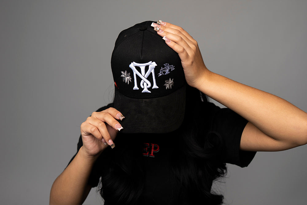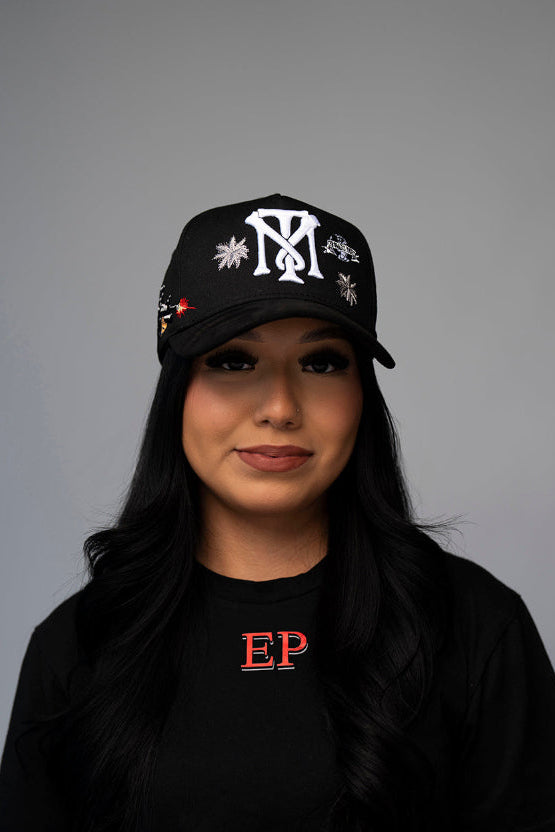 • Black cap featuring bold embroidered “TM” logo in white